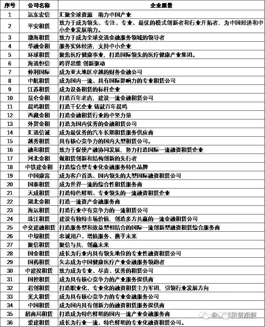 依据《2018年租赁公司盈利能力排行榜》中的名单,我抽取36家非银行系的租赁公司整理企业愿景,并做适当的简析。